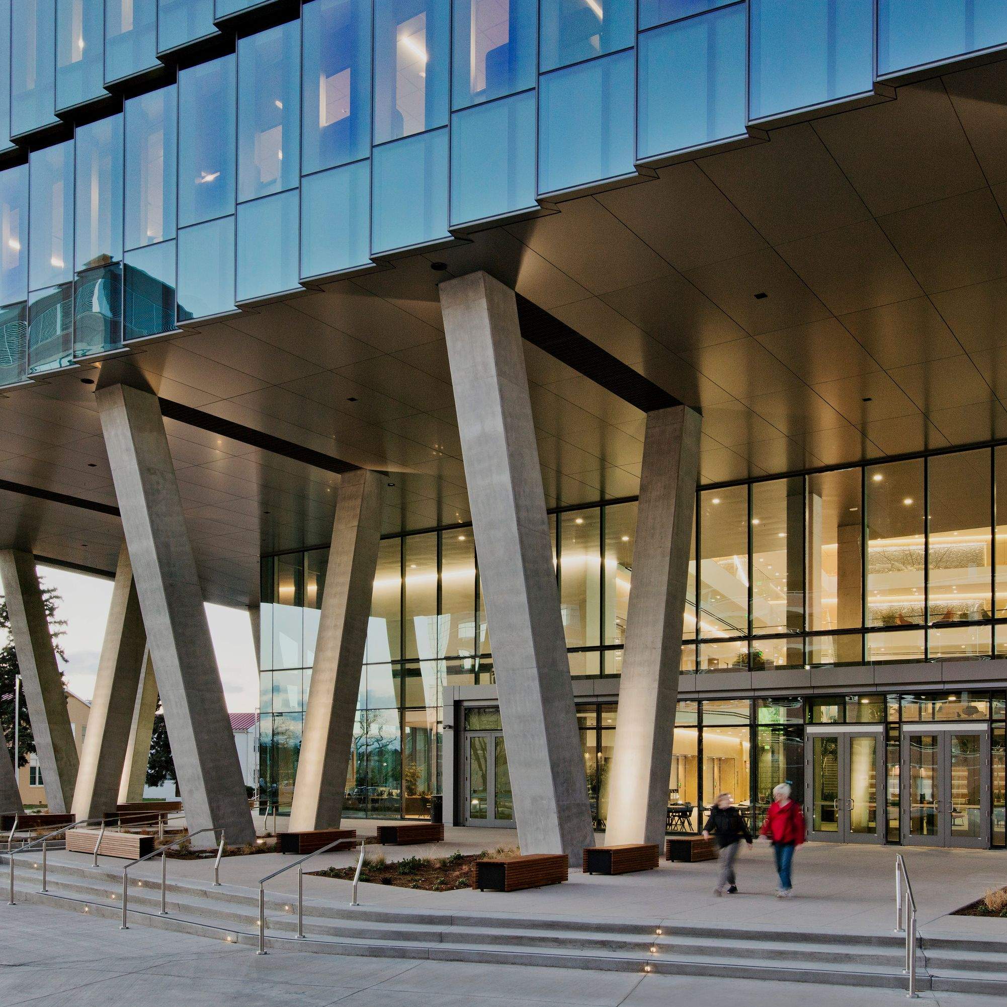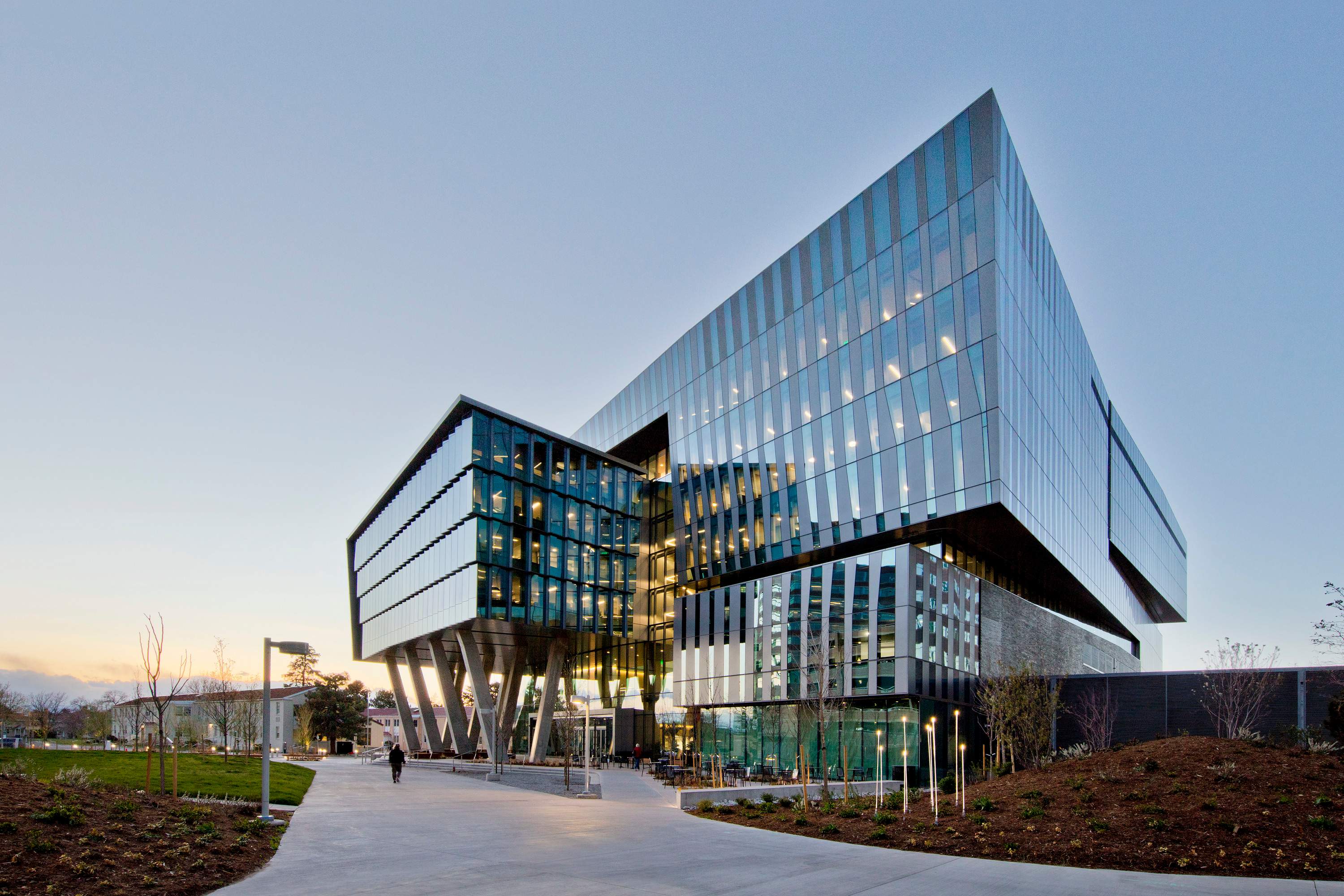 The building celebrates a notable campus entry point while creating a glowing beacon and a vibrant node of activity on the quarter-mile Artwalk promenade, a major east-west campus path. The building invites the public realm of the campus inside through the use of transparency and a south facing ‘porch,’ providing a welcoming entrance as well as a place to linger.